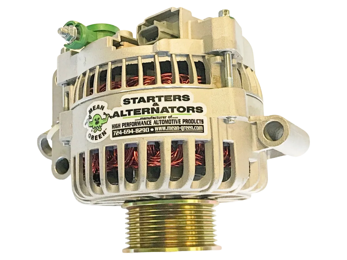 The Mean Green High Output Alternator is the answer to all your charging problems. The Mean Green Alternator's tool steel rotor shaft is supported at both ends by heavy duty double sealed bearings. Even the heavy-duty solid copper stator windings are sealed with high temperature insulation. Another is the heat resistant multi-function integrated regulator which continues to operate even at extreme temperatures.