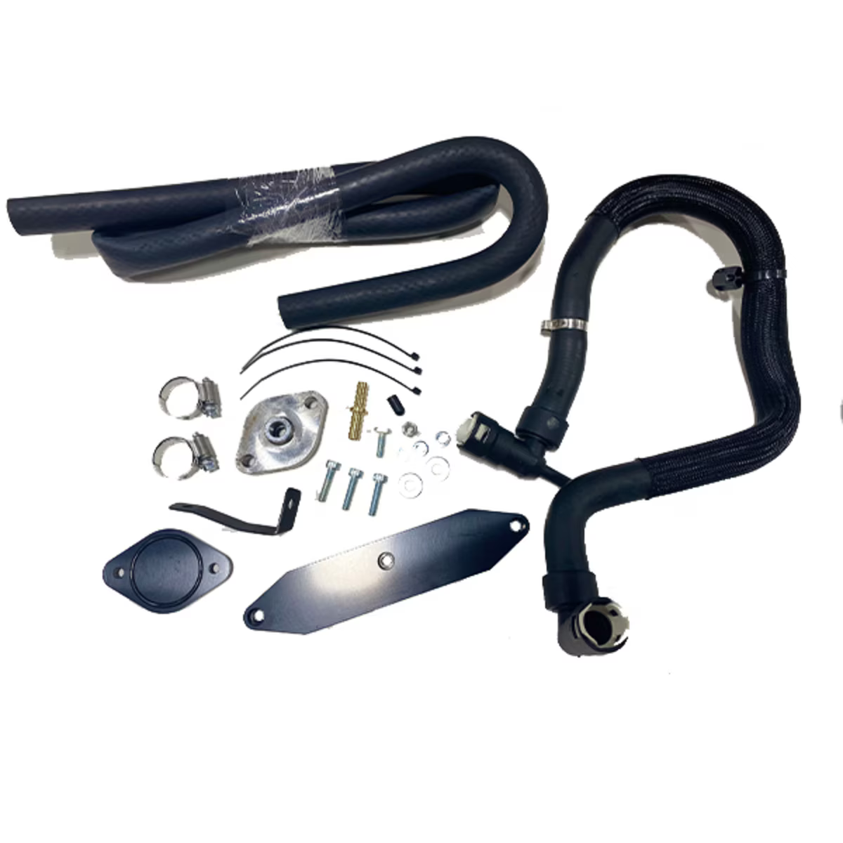 6.7 Powerstroke EGR valve/cooler delete kit is made out of machined billet aluminum and stainless steel. This kit allows you to fully remove the EGR cooler from your vehicle. This kit includes a pre-bent molded coolant reroute hose and the HVAC hose. Note: This kit must be used with EGR delete tuning! Fitment: 2015-2016 Ford 6.7L Powerstroke Diesel *Race Only* **This product is not legal for sale in the province of Ontario for road/highway use. Please check with local and provincial legislation/regulations for legality of such product/s. We assume no liability for misuse of this product/s.**