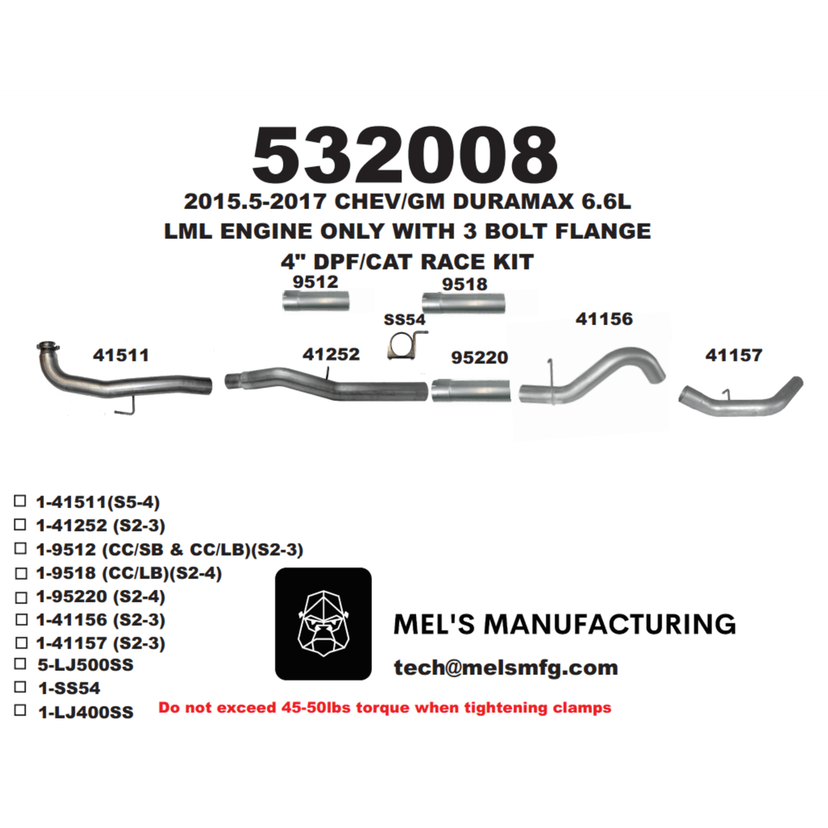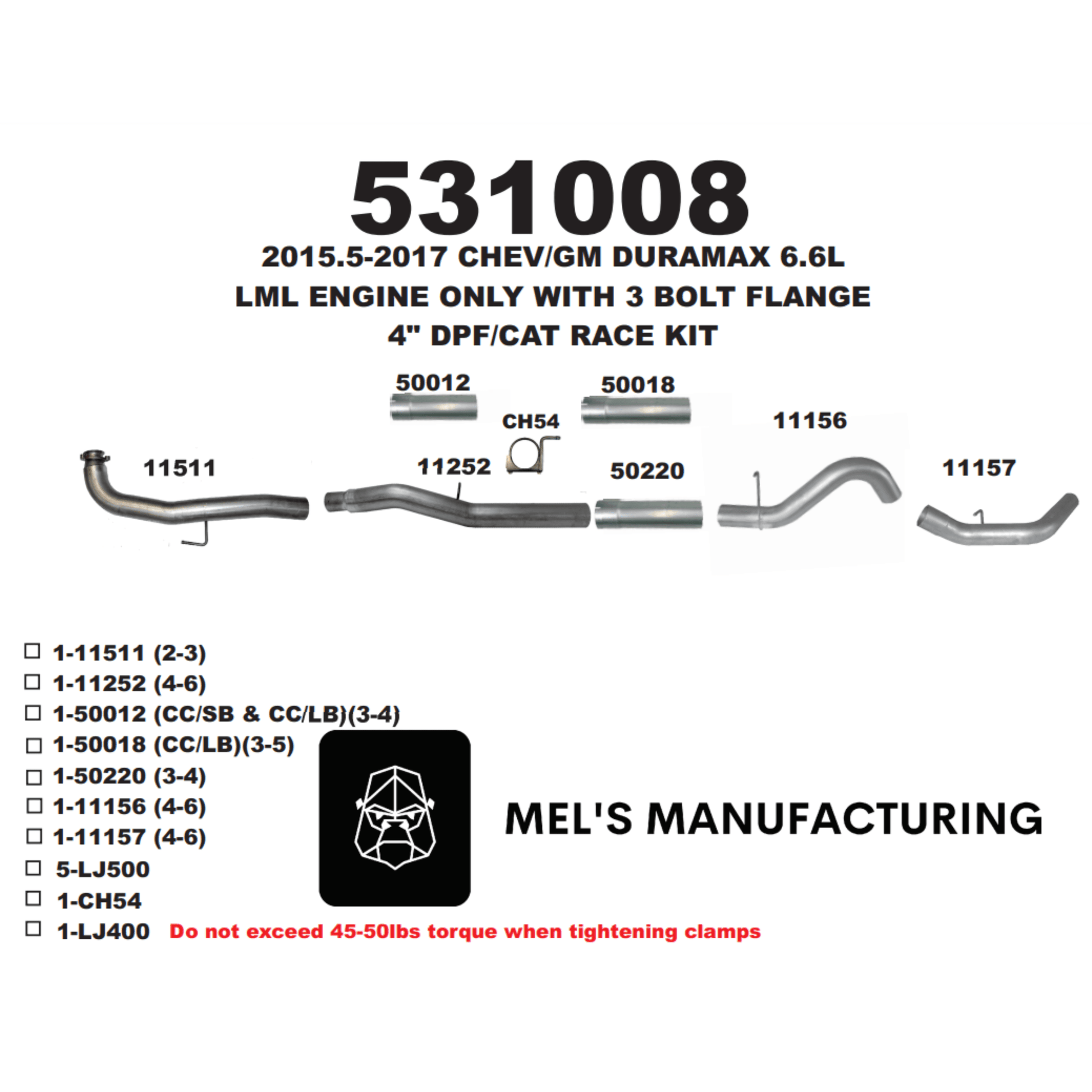 Constructed out of 16 gauge aluminized steel or T409 Stainless, this exhaust system is designed to simplify installation with included clamps, preweld contour bends and improved flanges. Enjoy a noticeable boost in performance, lowered EGTs and amplified air flow with this Mel's system. For powerhouse performance, Mel's delivers - horsepower you can hear!